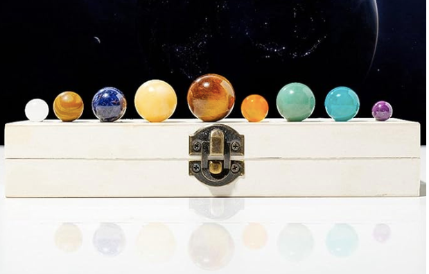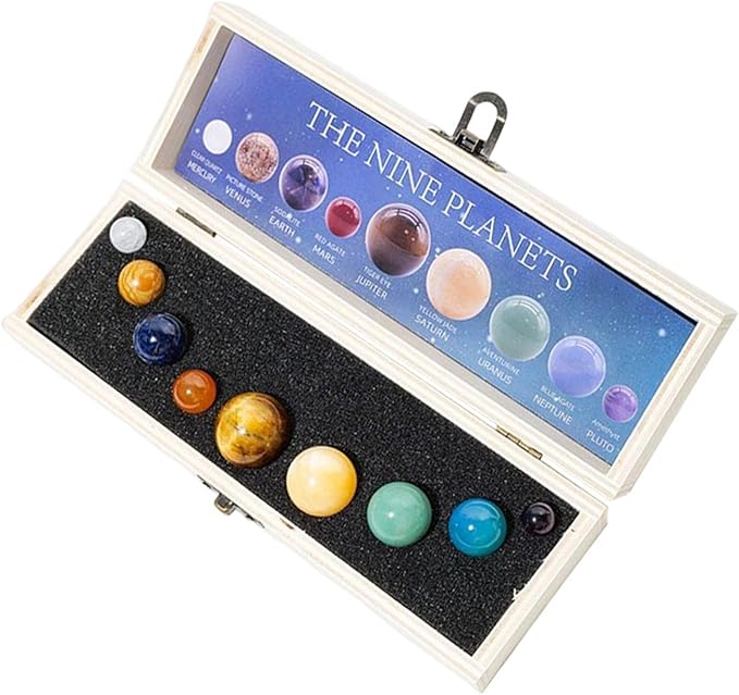 This 9-planet natural gemstone set is a unique collection, with each stone representing a celestial body in a modern planetary lineup. It includes:
