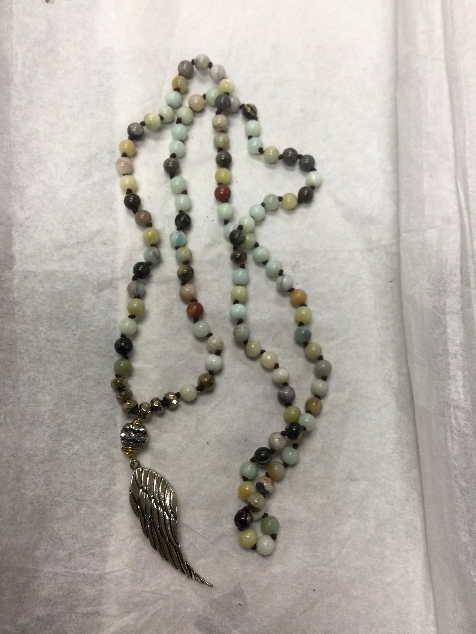 Variety of Amazonite toned beads (5mm) on a Mala, with a silver wing charm. 16” long Mala, 2.75” attachment.