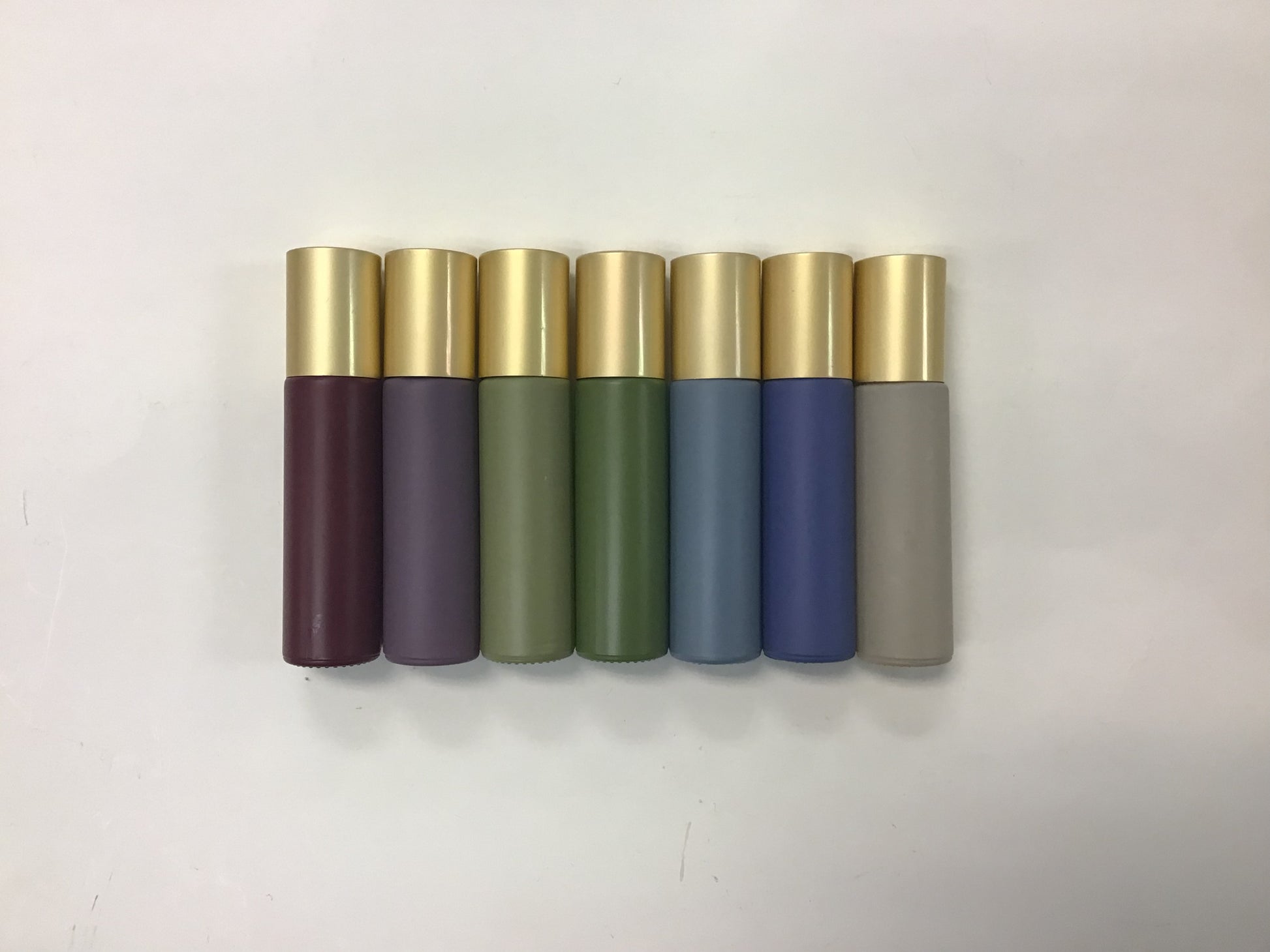 Assorted 10ml glass rollers in cool neutral tones with gold tops