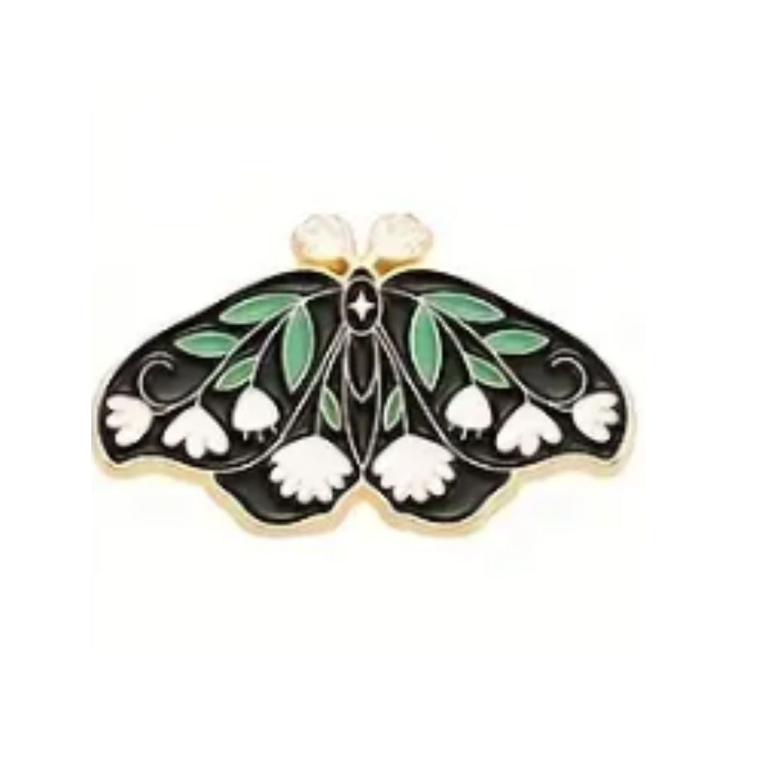 Butterfly Pin Black with Green Leaves/White Flower