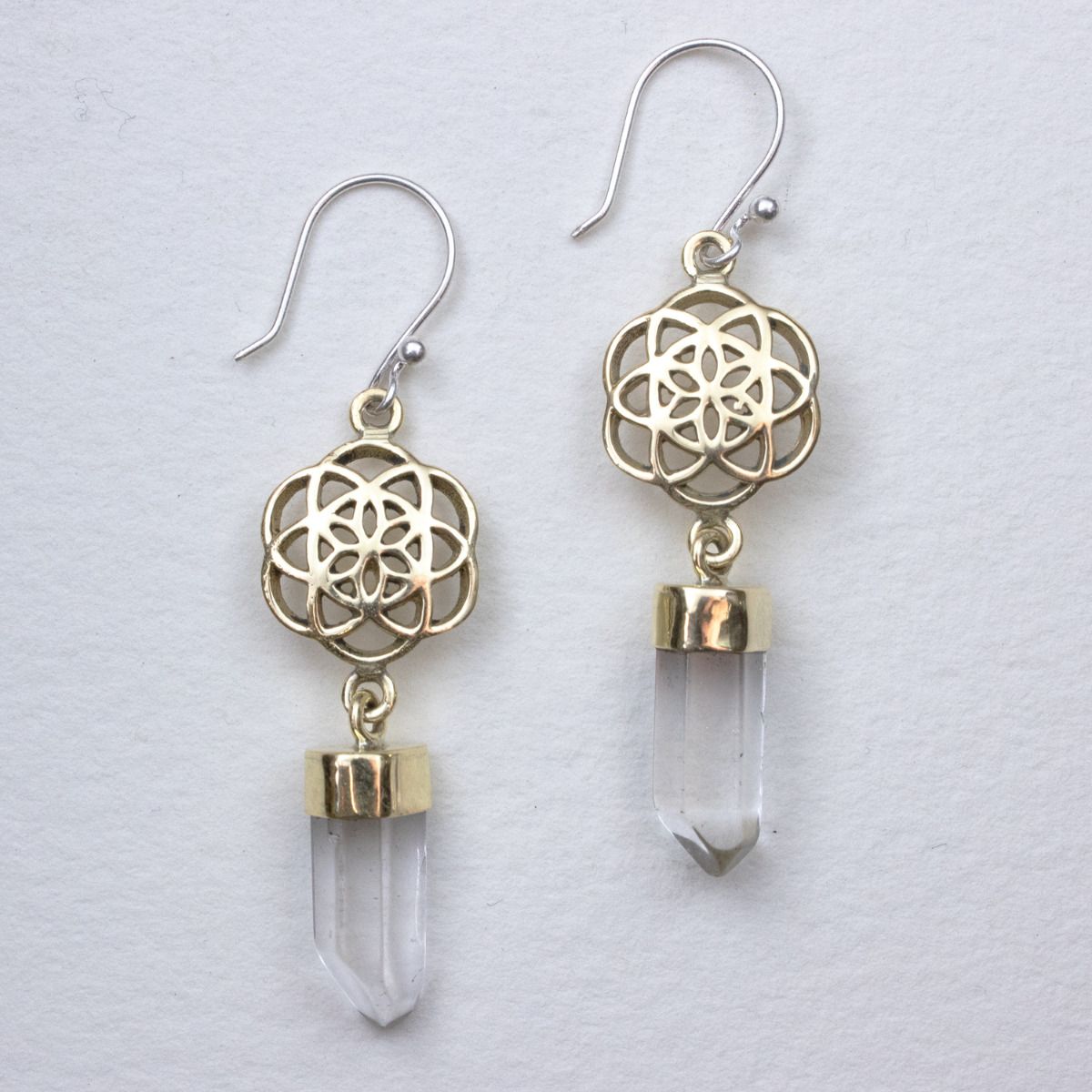 This seed of life motif is paired with a raw Quartz Crystal, bringing insight to spiritual one-ness. Made with hand-cast hypoallergenic brass and sterling silver earwires. Produced in Fair Trade workshop in Nepal