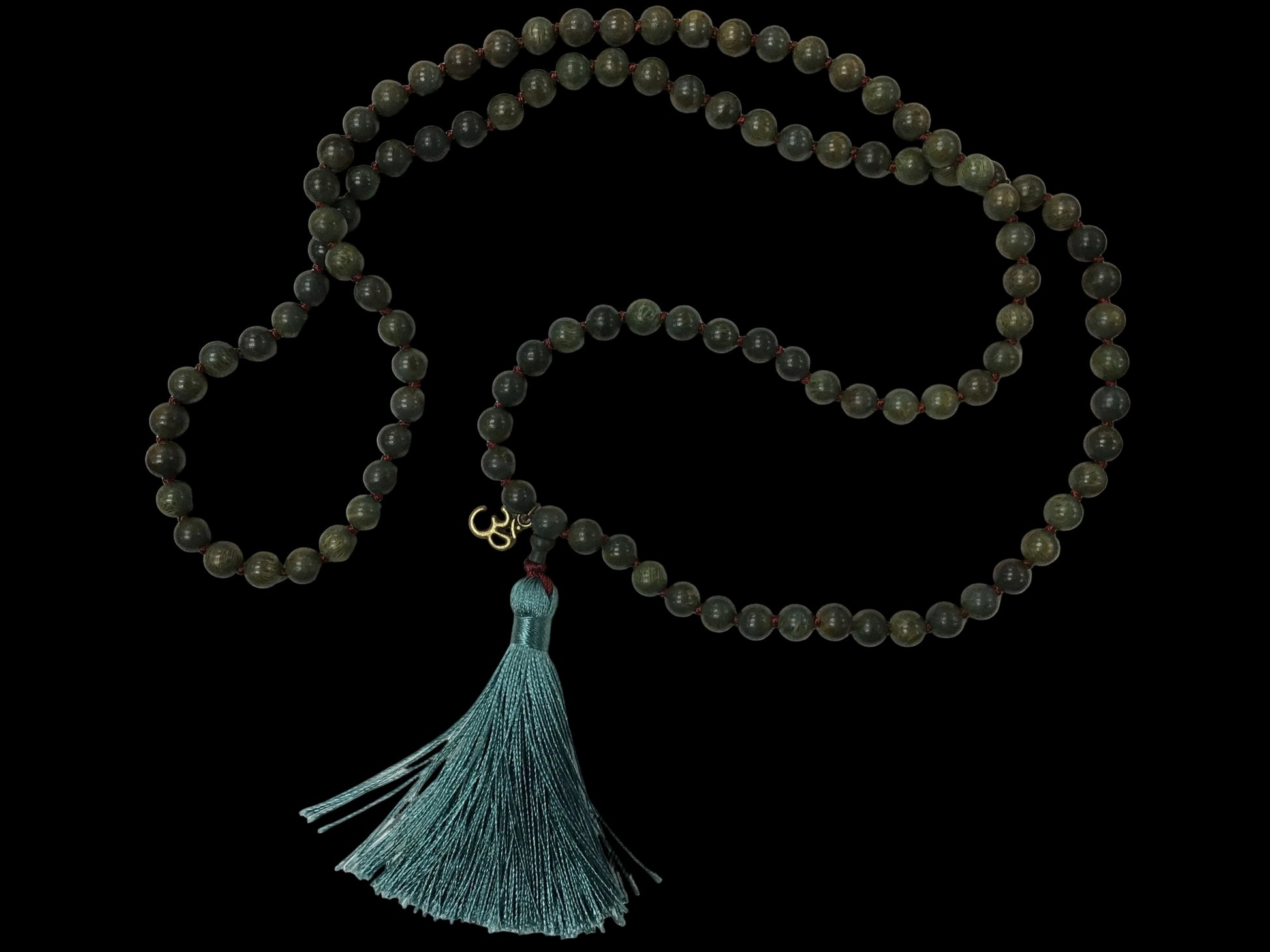 Green beaded Mala with Ohm charm and teal tassel. (Wood)