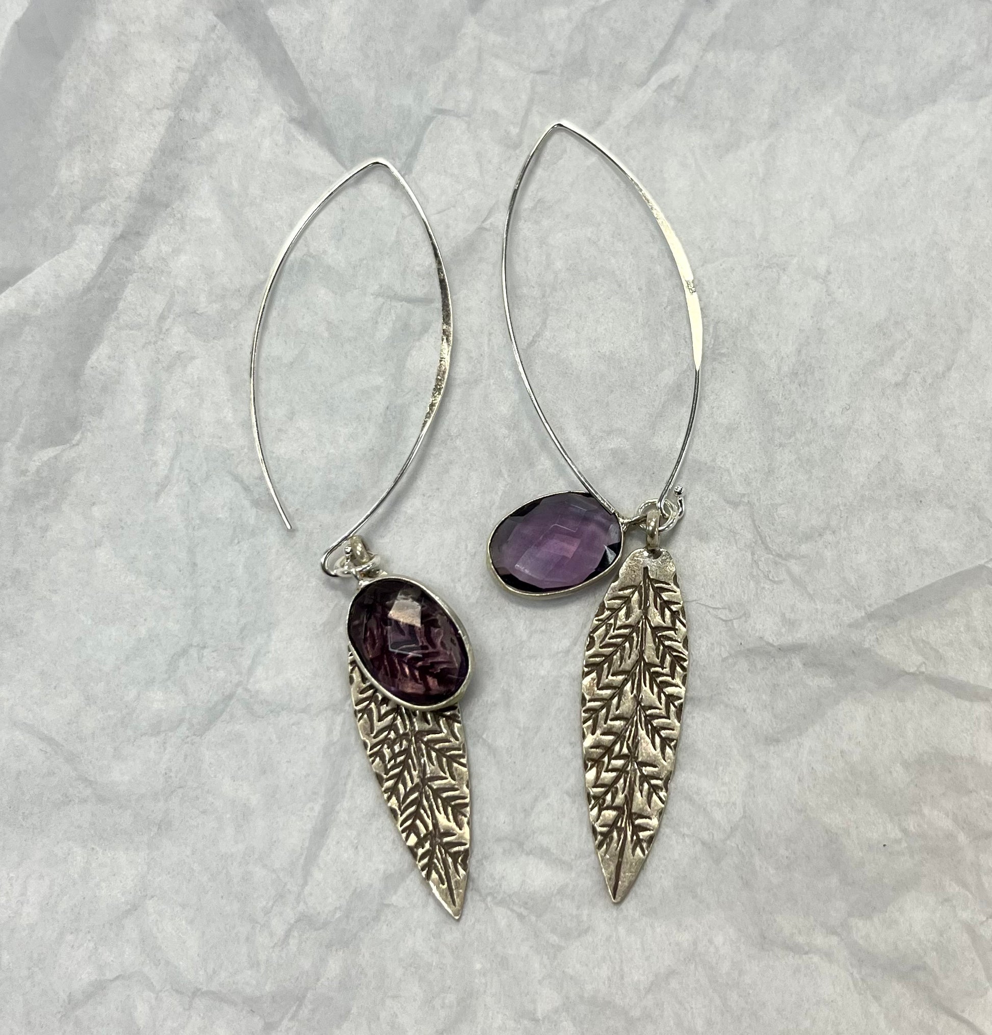 Handcrafted Dangle Silver Earring with Faceted Amethyst with Large Pressed Silver Leaf