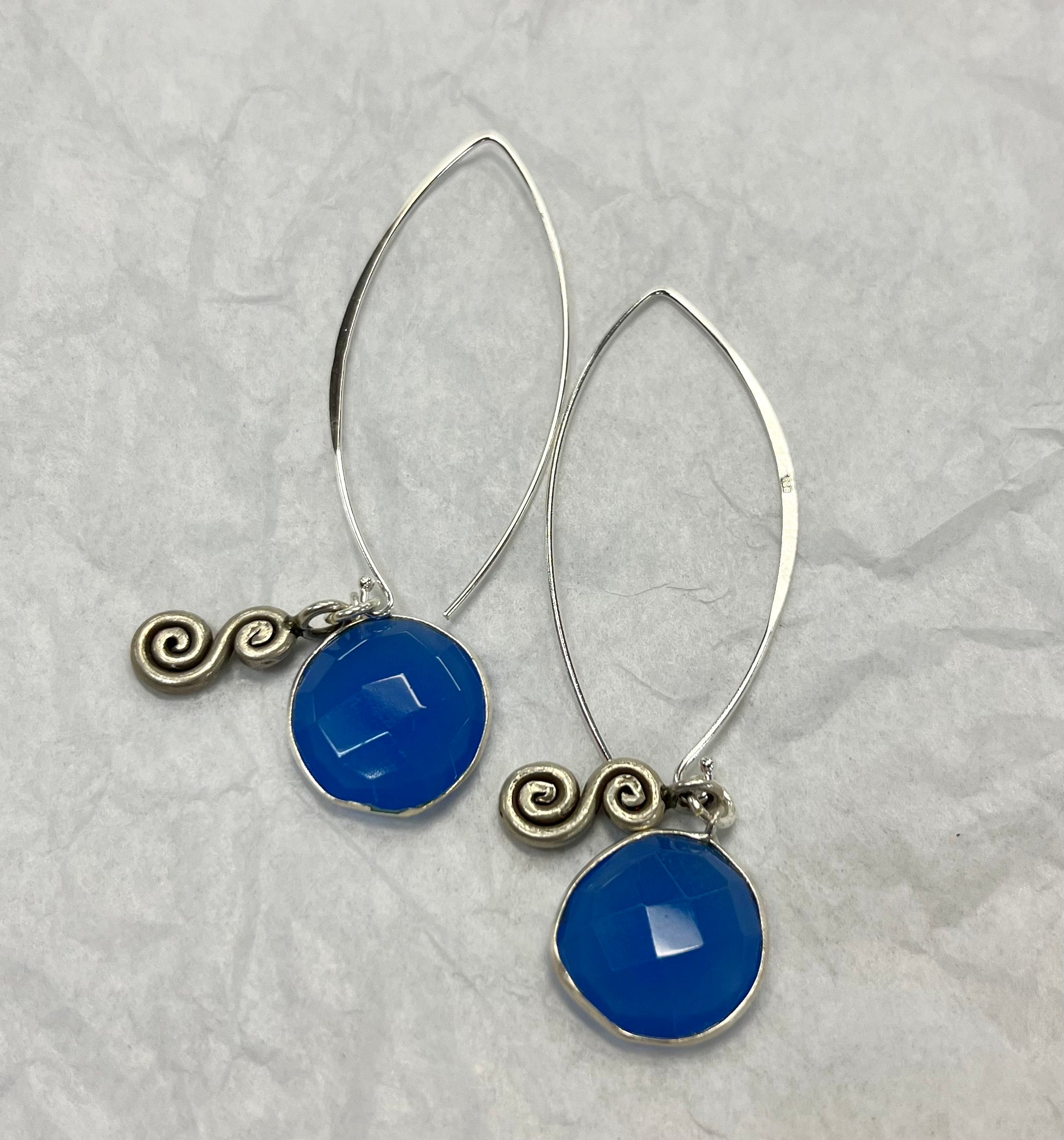 Handcrafted Dangle Silver Earring with Faceted Blue Chalcedony and Silver Spiral Bead