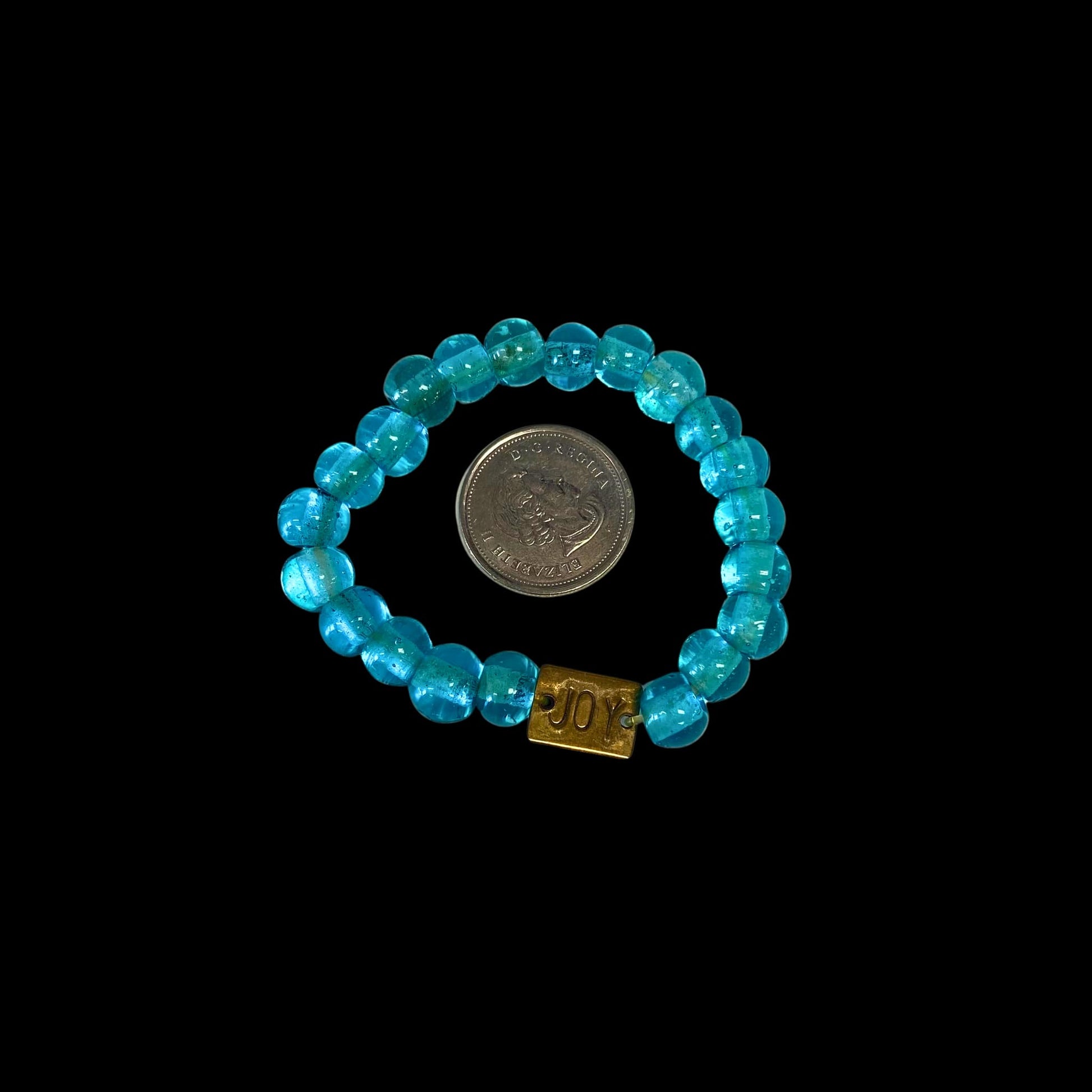 Glass bead stretchy bracelet with brass ‘Joy’ plate attached.