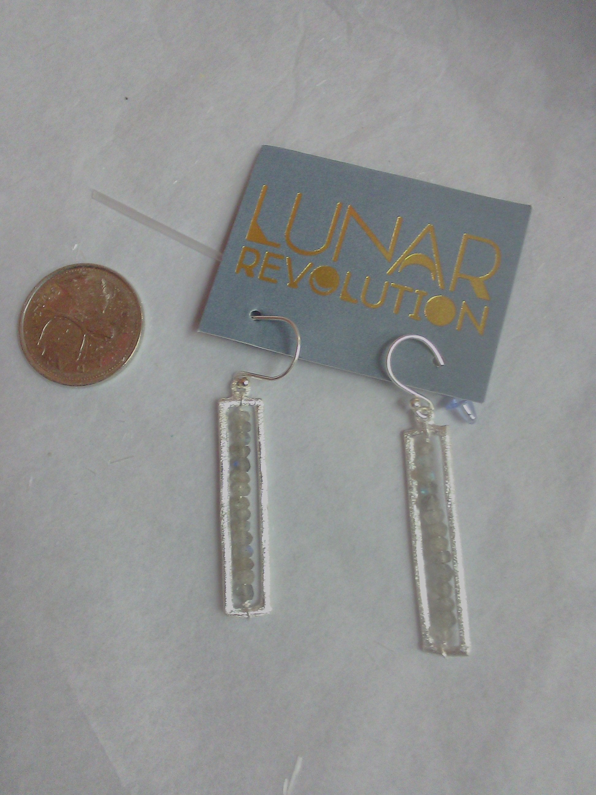 Lunar Revolution - Crystal Fortress earrings. Long rectangular metal earrings with strand of white/grey crystal beads in the centre.