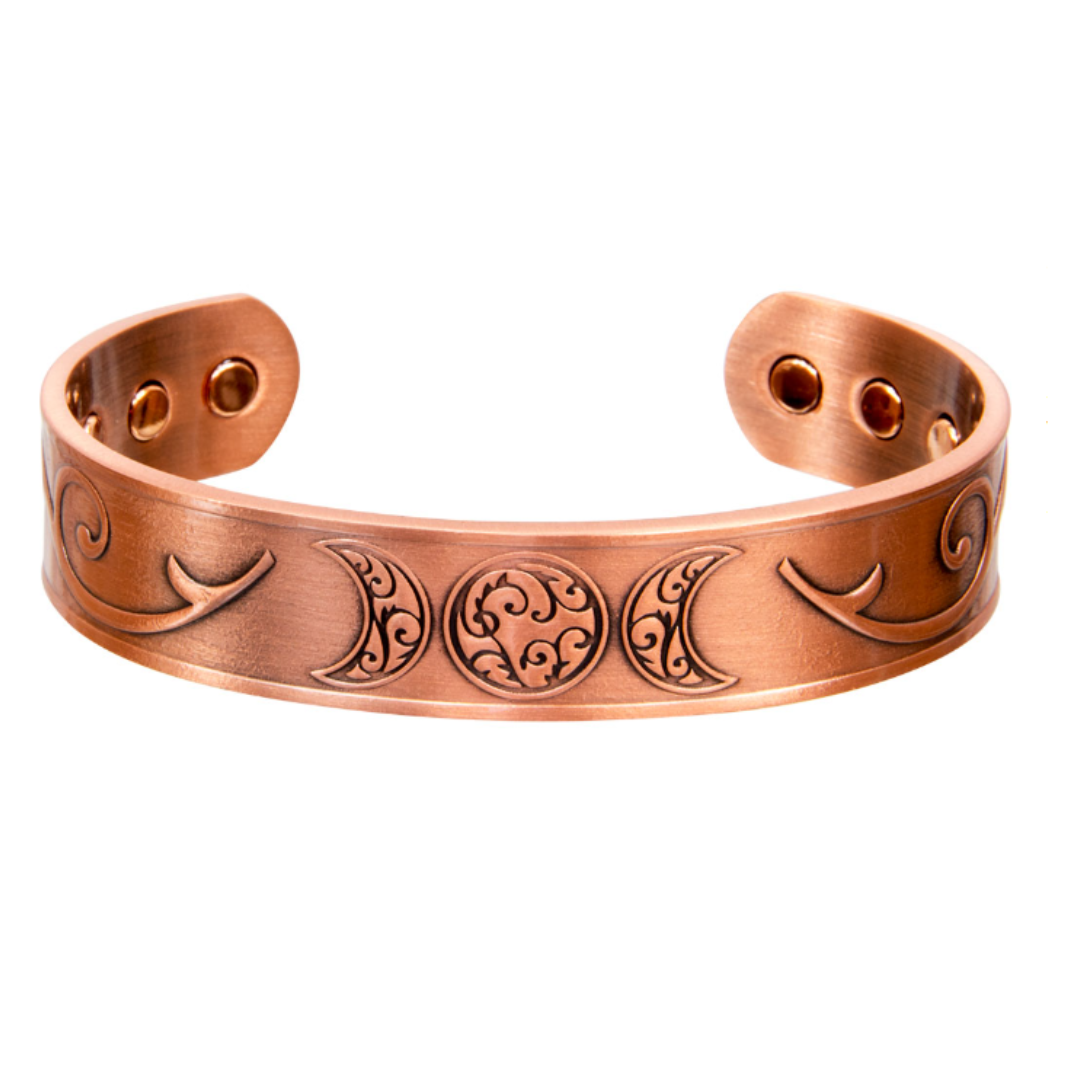 Triple Moon features an open cuff design with gentle flexibility for a comfortable fit. Integrated magnets are known to support circulation and promote balance in daily life. The Triple Moon symbol represents the waxing, full, and waning phases of the moon, mirroring the maiden, mother, and crone aspects of the feminine cycle. It invites reflection, intuition, and an acceptance of all life’s stages. Wear as a subtle tribute to your evolving strength and the wisdom that unfolds with time.