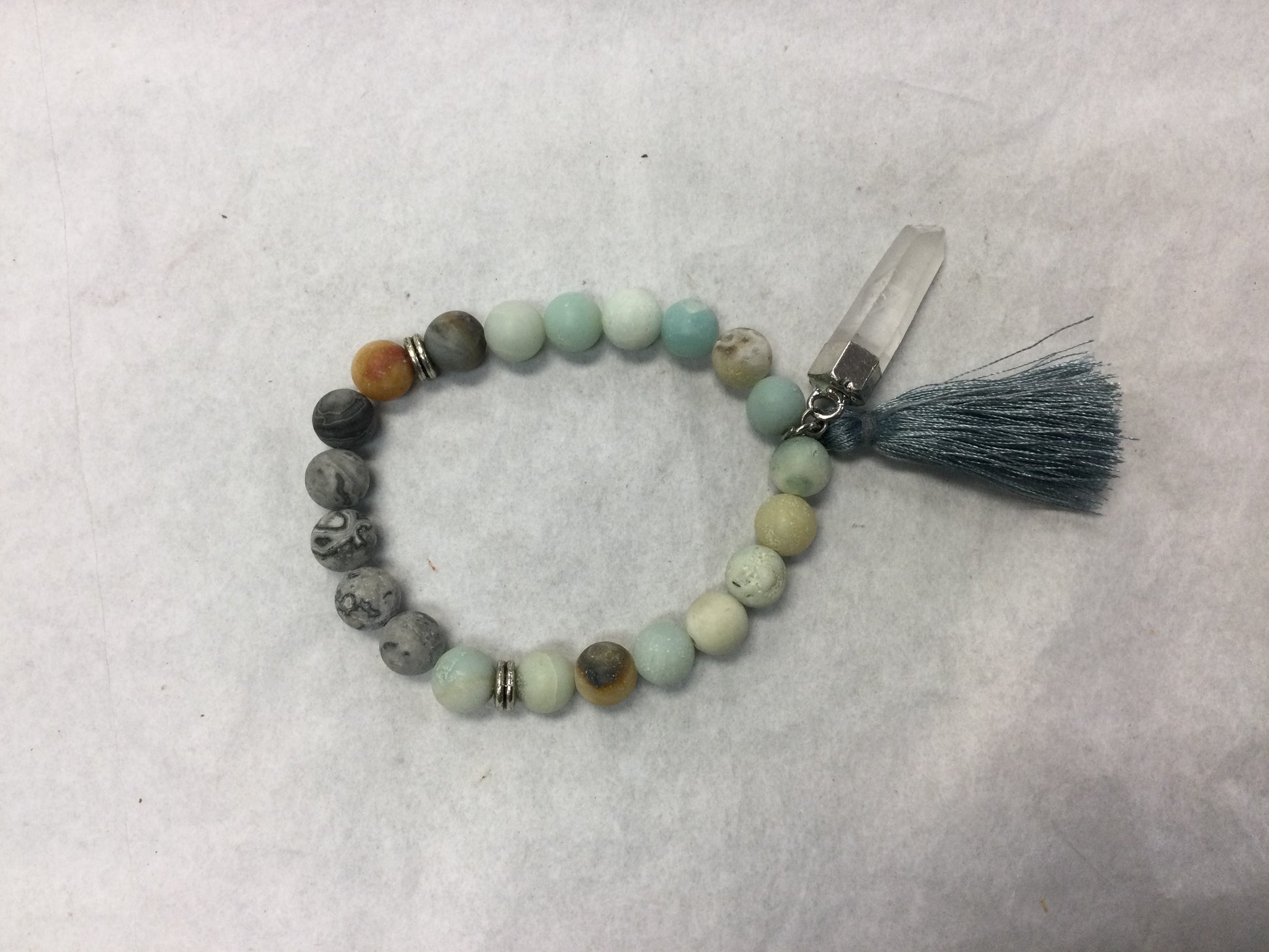 Matte Amazonite and Map Stone Mala Bracelet with Tassle and Quartz Point.