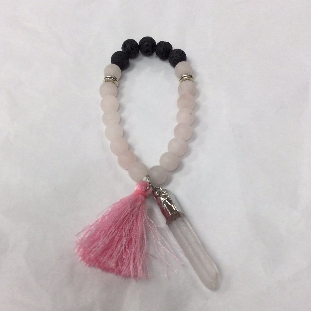 Matte Rose Quartz and Lava Stone Bracelet with Quartz Point and Tassle