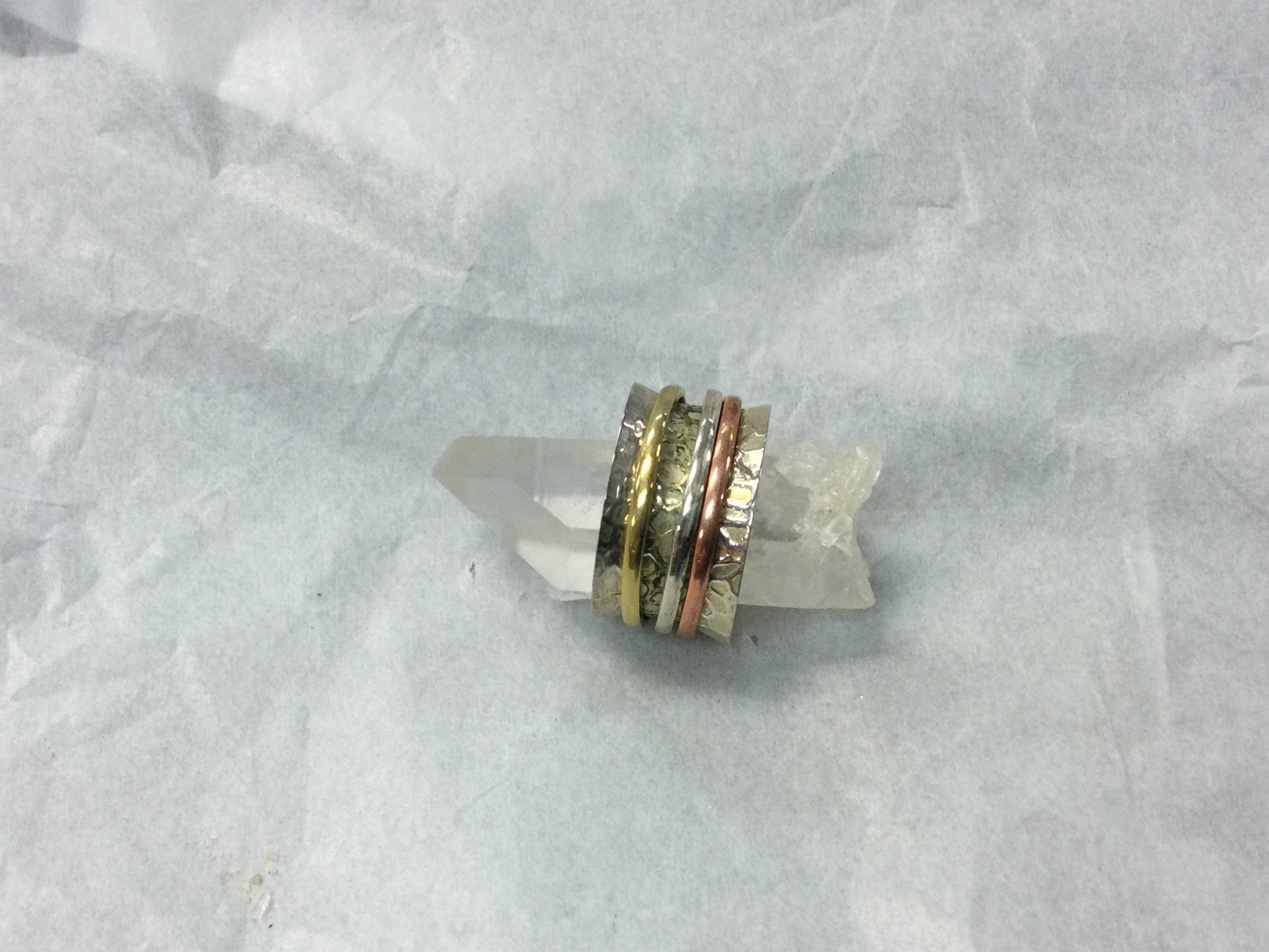 Meditation Ring, Patterned Silver Base with Copper, Silver and brass rings