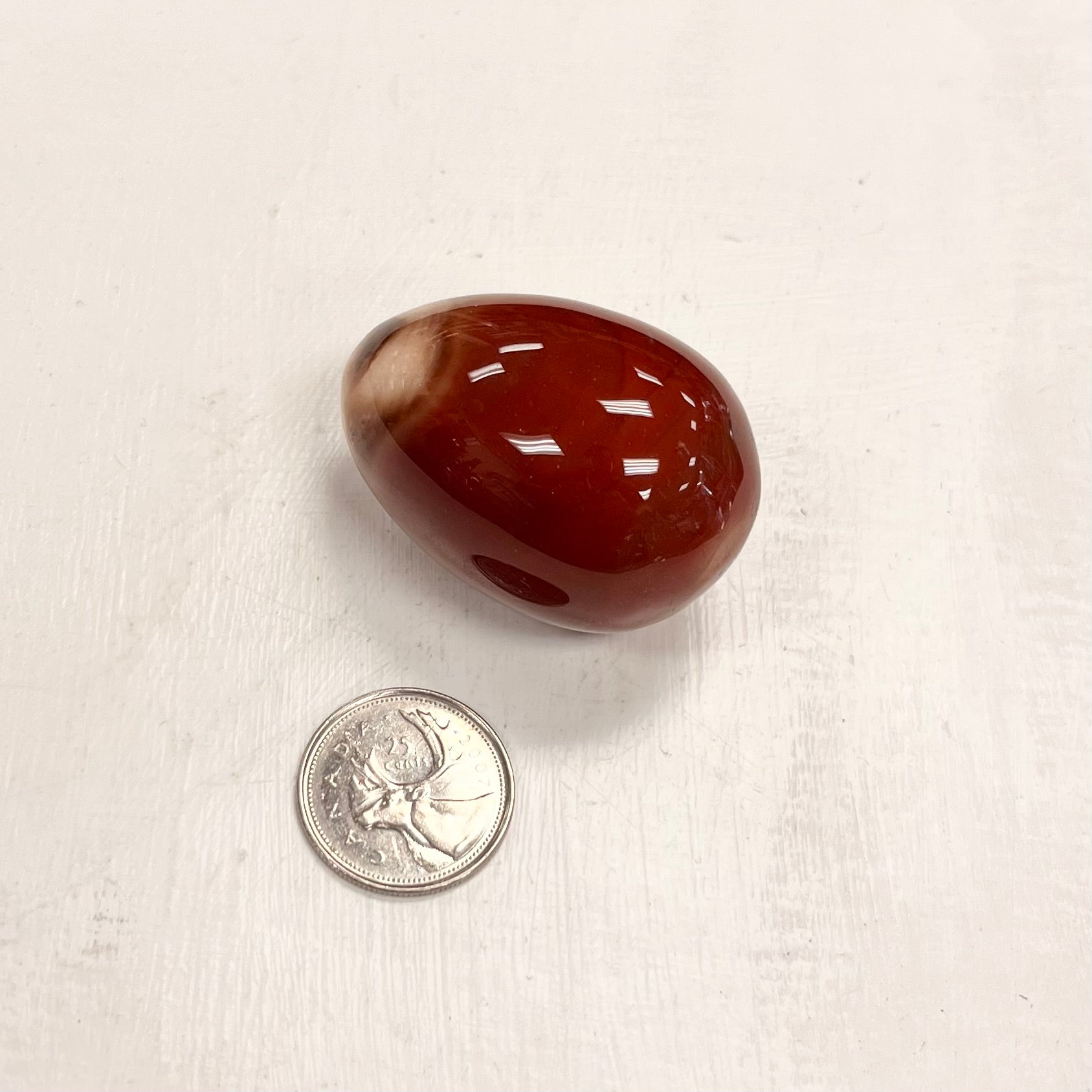 A vibrant symbol of vitality, creativity, and emotional balance. The egg shape represents growth and new beginnings, while the bold bands of orange agate boost confidence, stability, and energize the sacral chakra.