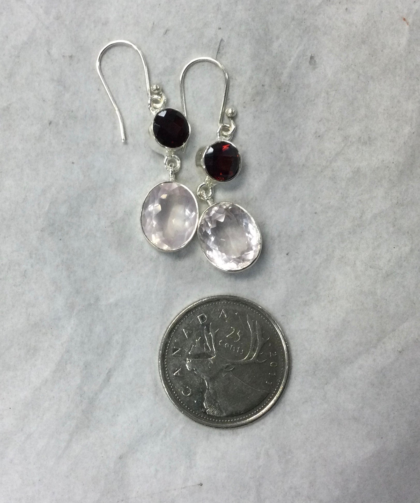 Rose Quartz and garnet set in sterling silver on silver hooks