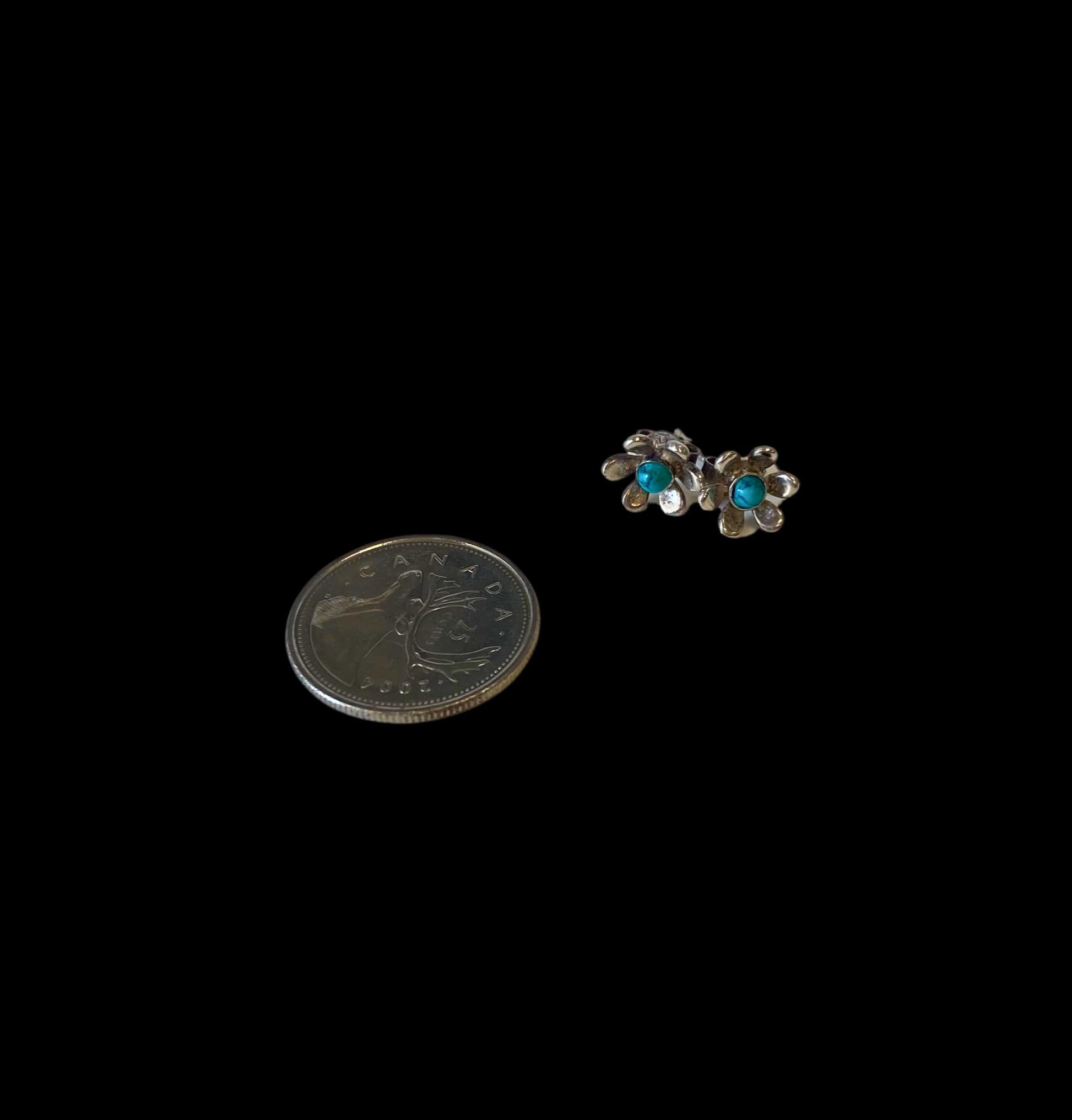 Sterling silver stud earrings with flower accents and synthetic turquoise bead features.