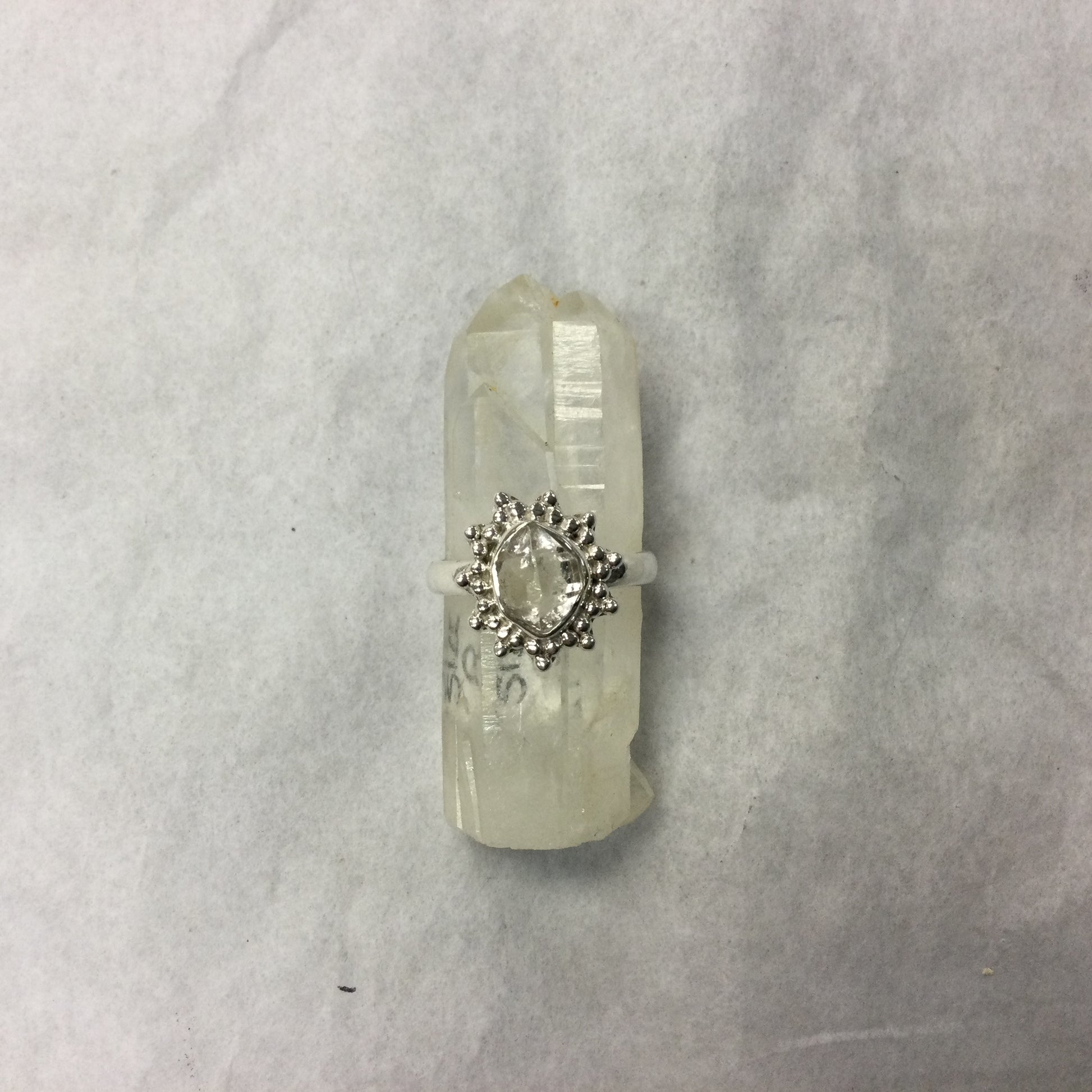 A sterling silver ring with a Herkimer Diamond, cut into a double-point, in a dotted pattern frame.