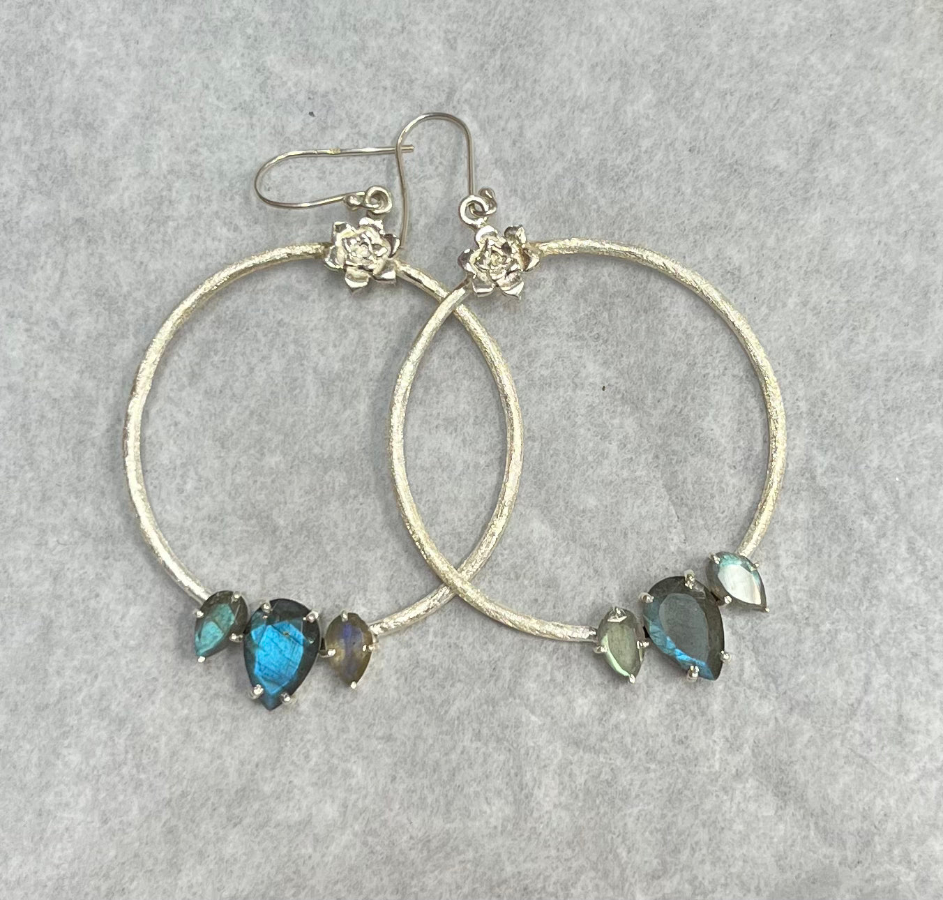 Silver Hoop Labradorite Earrings Faceted with Lotus Emblem