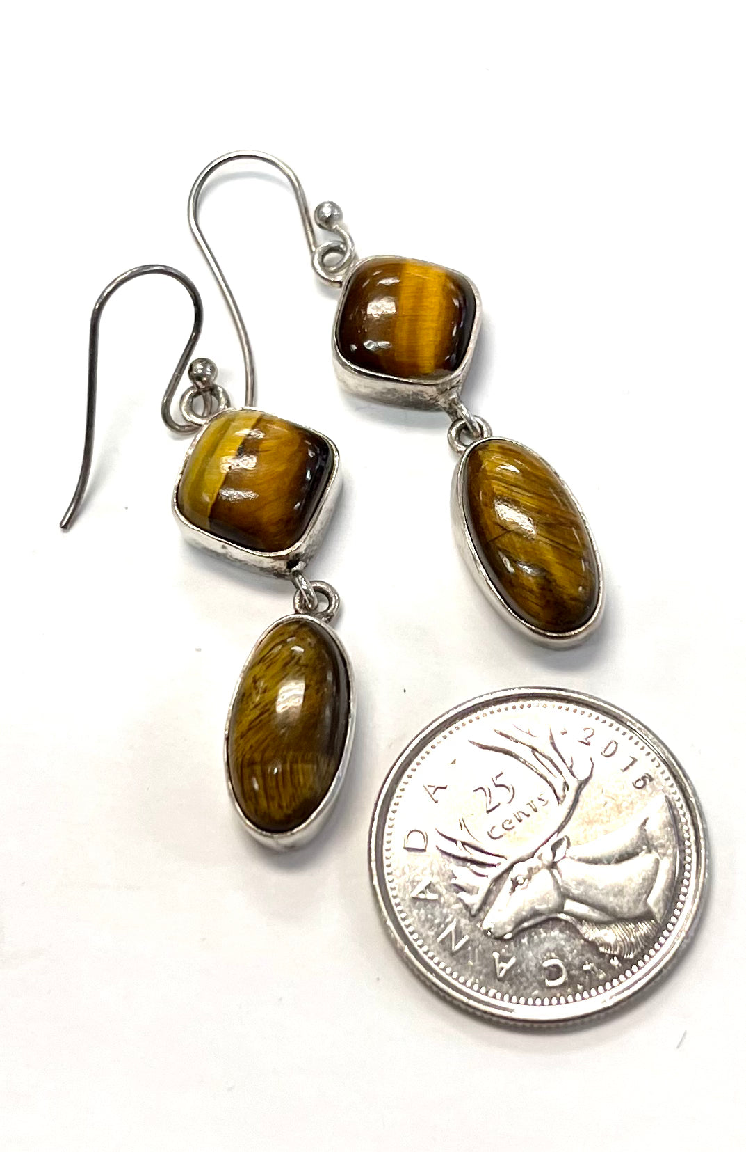 Tiger Eye Earrings Dangle Stacked Two Stones Set in Silver