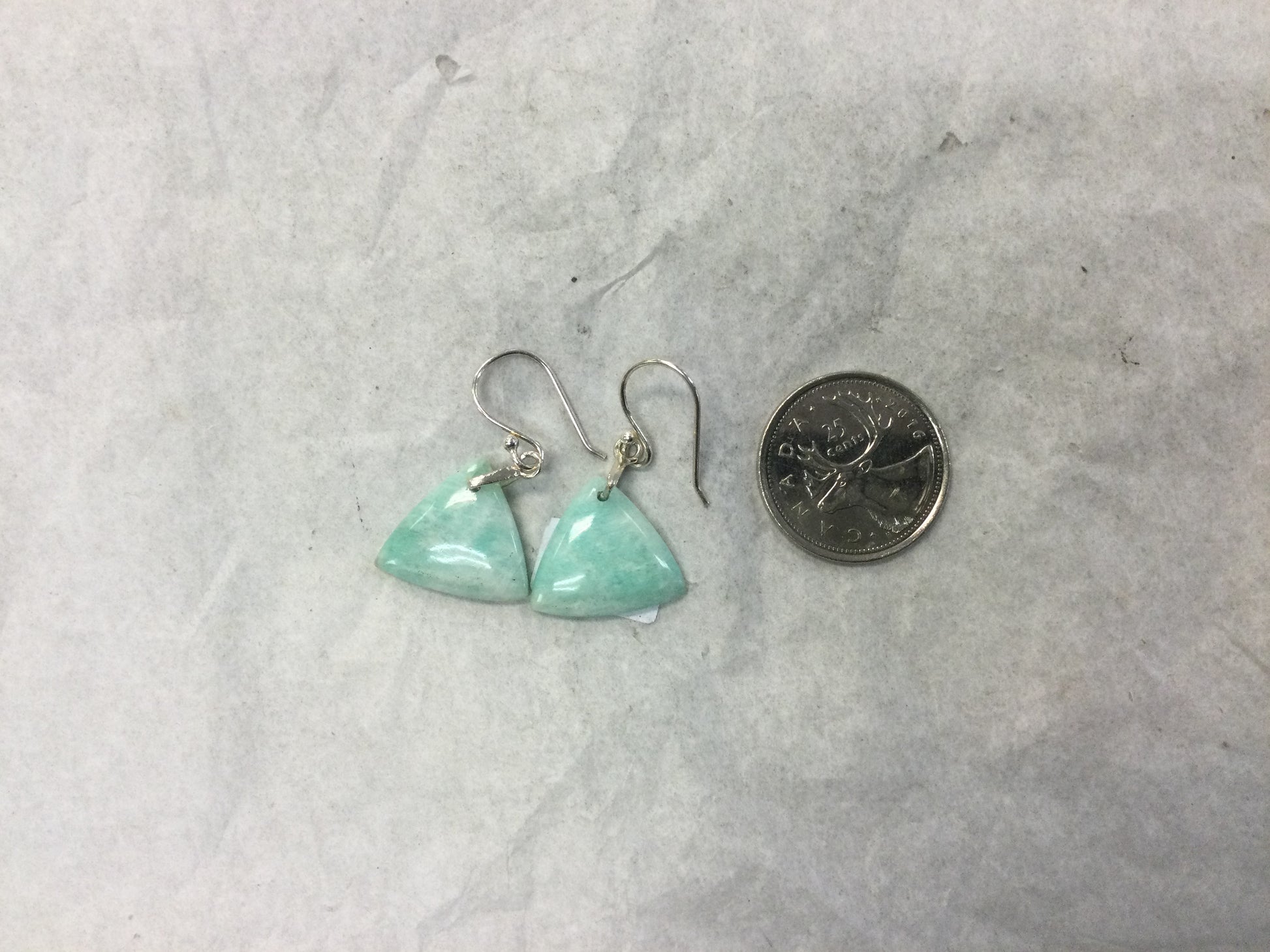 Polished light teal Amazonite earrings in triangles with silver hooks