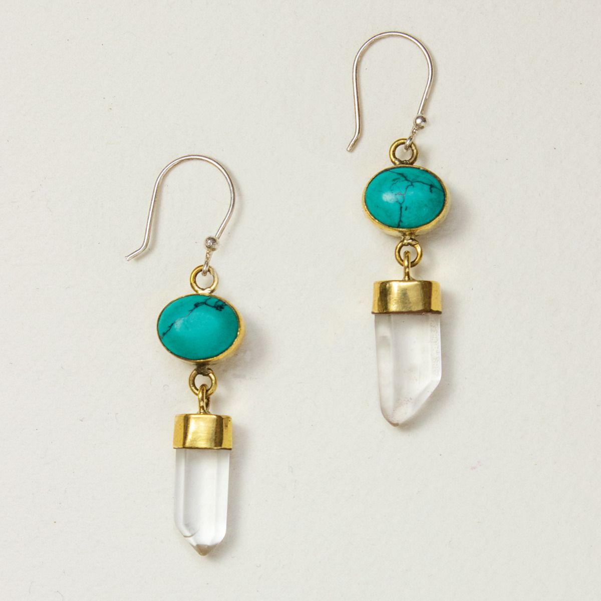 Turquoise is known to invoke luck and longevity, while quartz promotes clarity and amplifies its pairings. Hand-cast, hypoallergenic brass with sterling earwires. Produced in Fair Trade workshop in India.